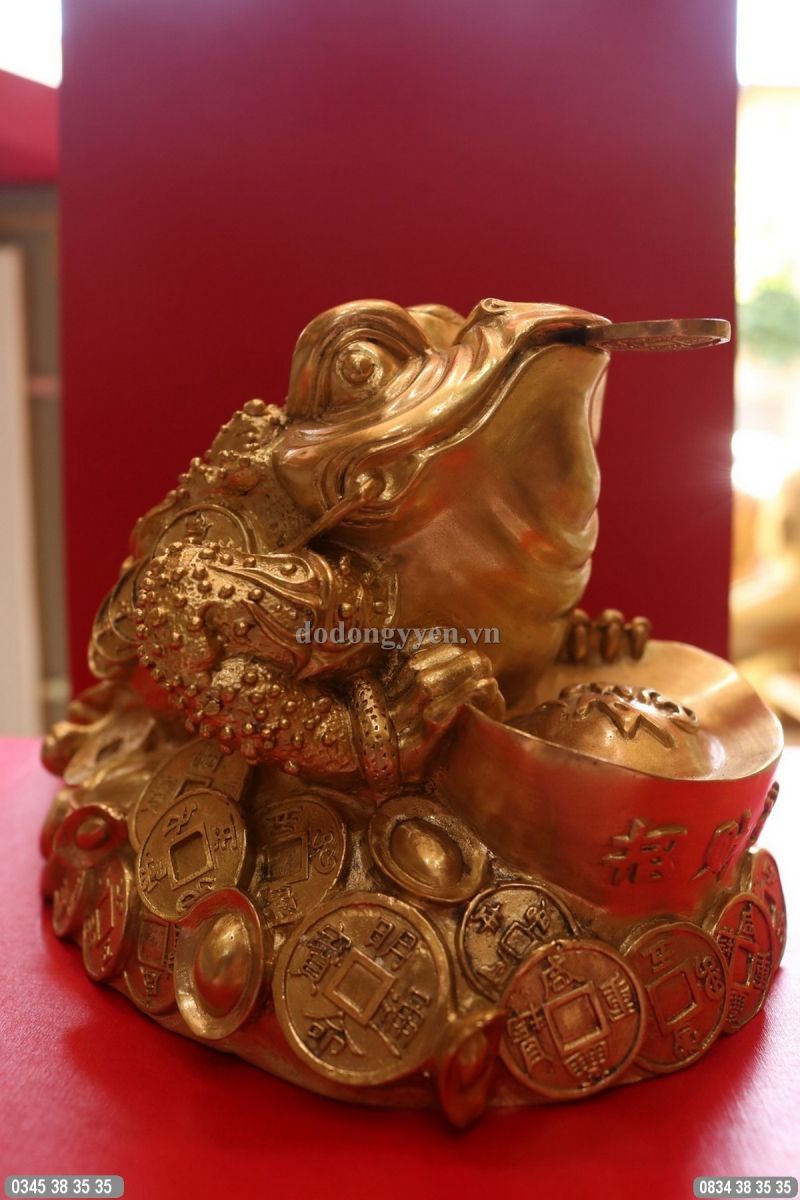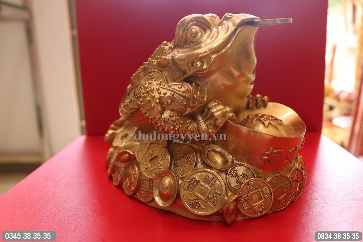 Cóc ngậm tiền bằng đồng dát vàng 9999 đúc từ đồng thau tinh khiết, gia công rất đẹp, dát vàng 9999 toàn bộ bề mặt
