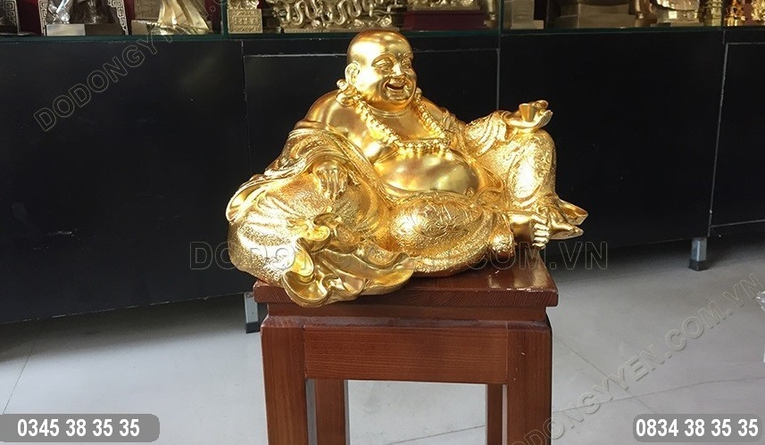 Tượng Phật Di Lặc Thếp Vàng - Dát Vàng: đúc từ nguyên liệu đồng cát tút, đồng vỏ đạn cao cấp, dát một lớp vàng mỏng 9999 bên ngoài tuyệt đẹp