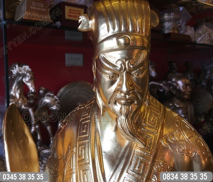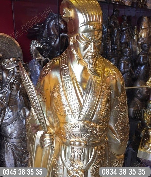 Tượng Khổng Minh cao 70cm nặng 30kg đúc từ đồng đỏ nguyên khối rất đẹp, chạm khắc hoa văn tinh xảo, đường kim mũi chỉ tinh tế, bên ngoài được thếp vàng quỳ, vàng lá sang trọng, đẳng cấp