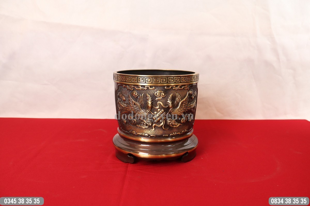 Quy cách: Bát hương được đúc thủ công bằng đồng thau, sau đó hun màu higlight, một mặt đúc nổi hình song long chầu mặt nguyệt, mặt sau đúc hình đôi chim phượng.