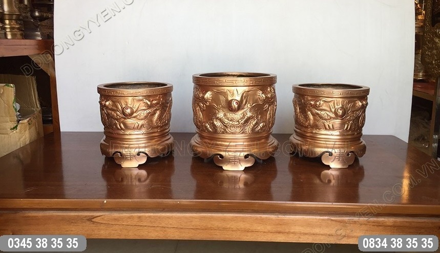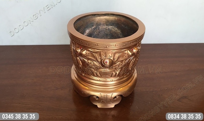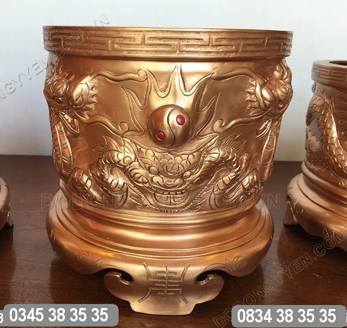 Bát Hương Đồng chạm biểu tượng Rồng Chầu Mặt Nguyệt của Đồ Đồng Cường Thịnh được đúc bằng đồng đỏ nguyên khối, bề mặt chạm đôi rồng nổi vô cùng đẹp và sinh động.