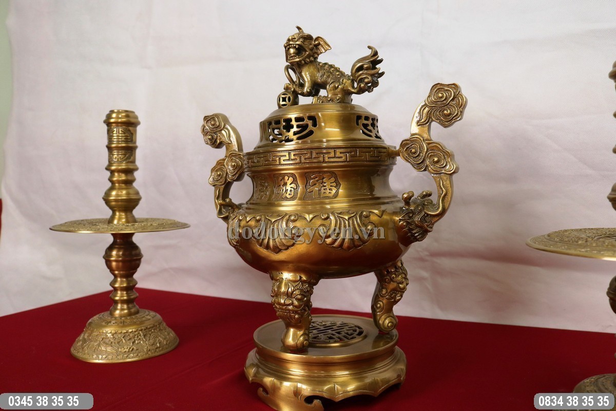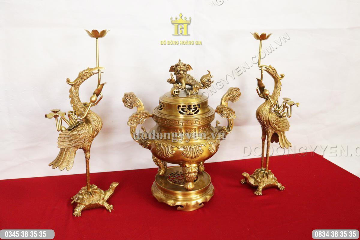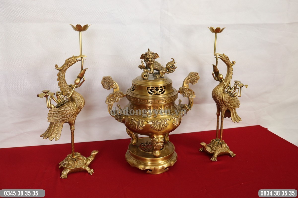 Quy cách: Bộ tam sự đúc từ nguyên liệu đồng vàng nguyên chất sau đó xuống màu hun, gồm một đỉnh đồng và một đôi hạc hoặc đôi chân nến.