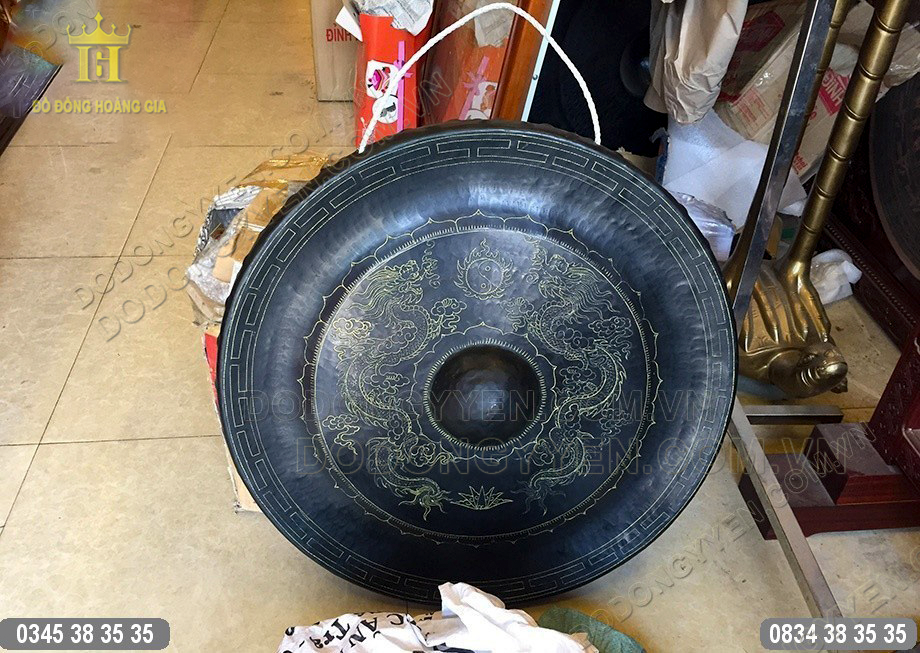 Quy cách: Chiêng đồng đúc từ đồng thanh khiết màu đen óng, bề mặt ám hoa văn họa tiết rồng chầu mặt nguyệt vô cùng tinh xảo theo phương pháp thủ công truyền thống của làng nghề đúc đồng Nam Định.