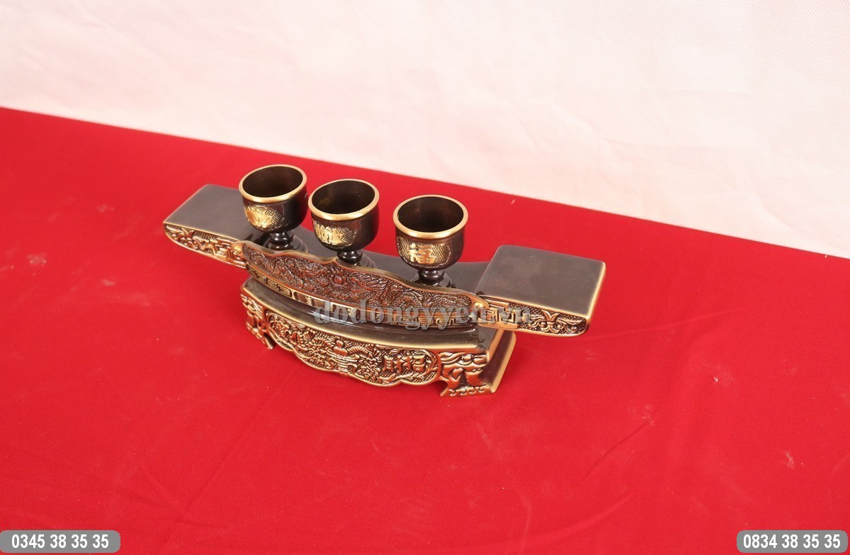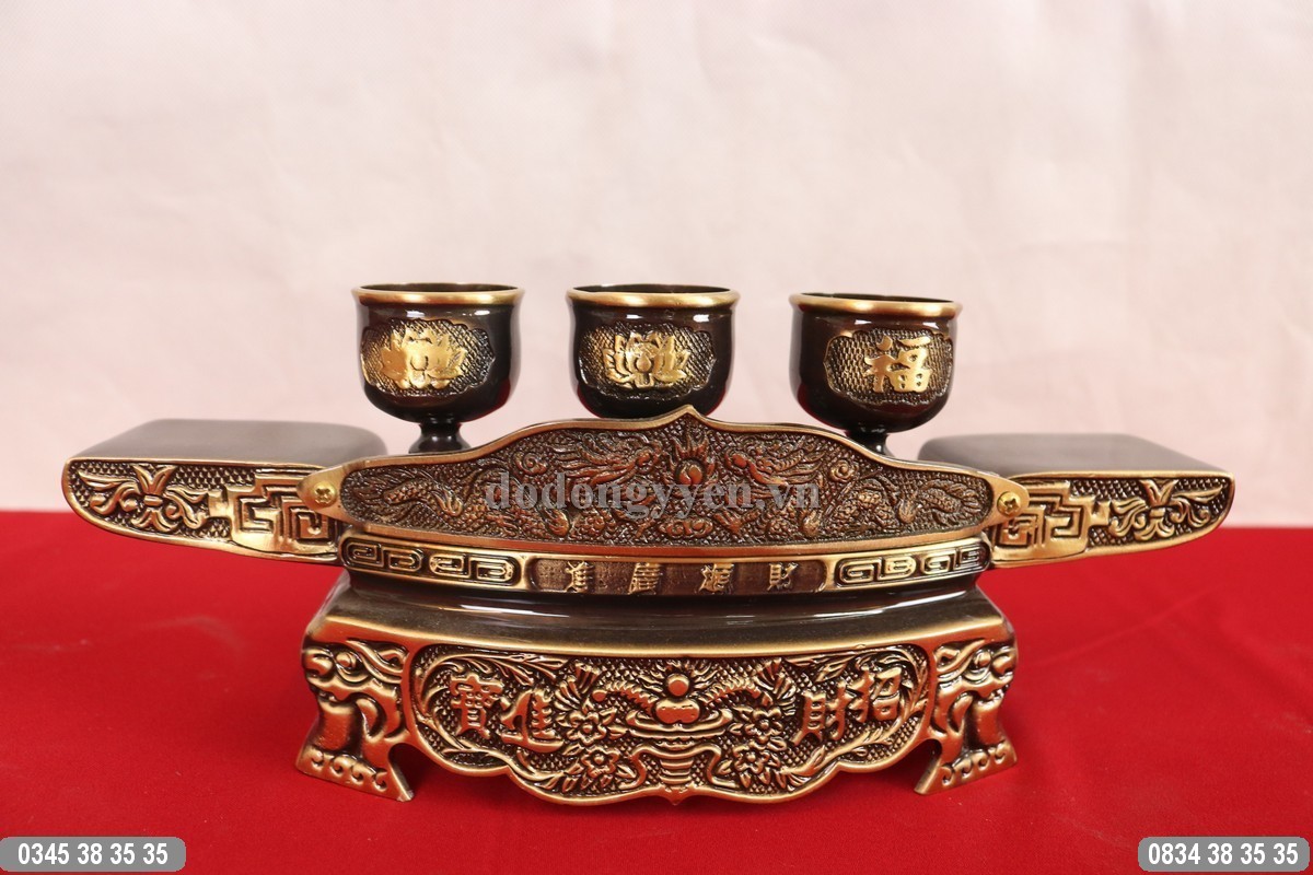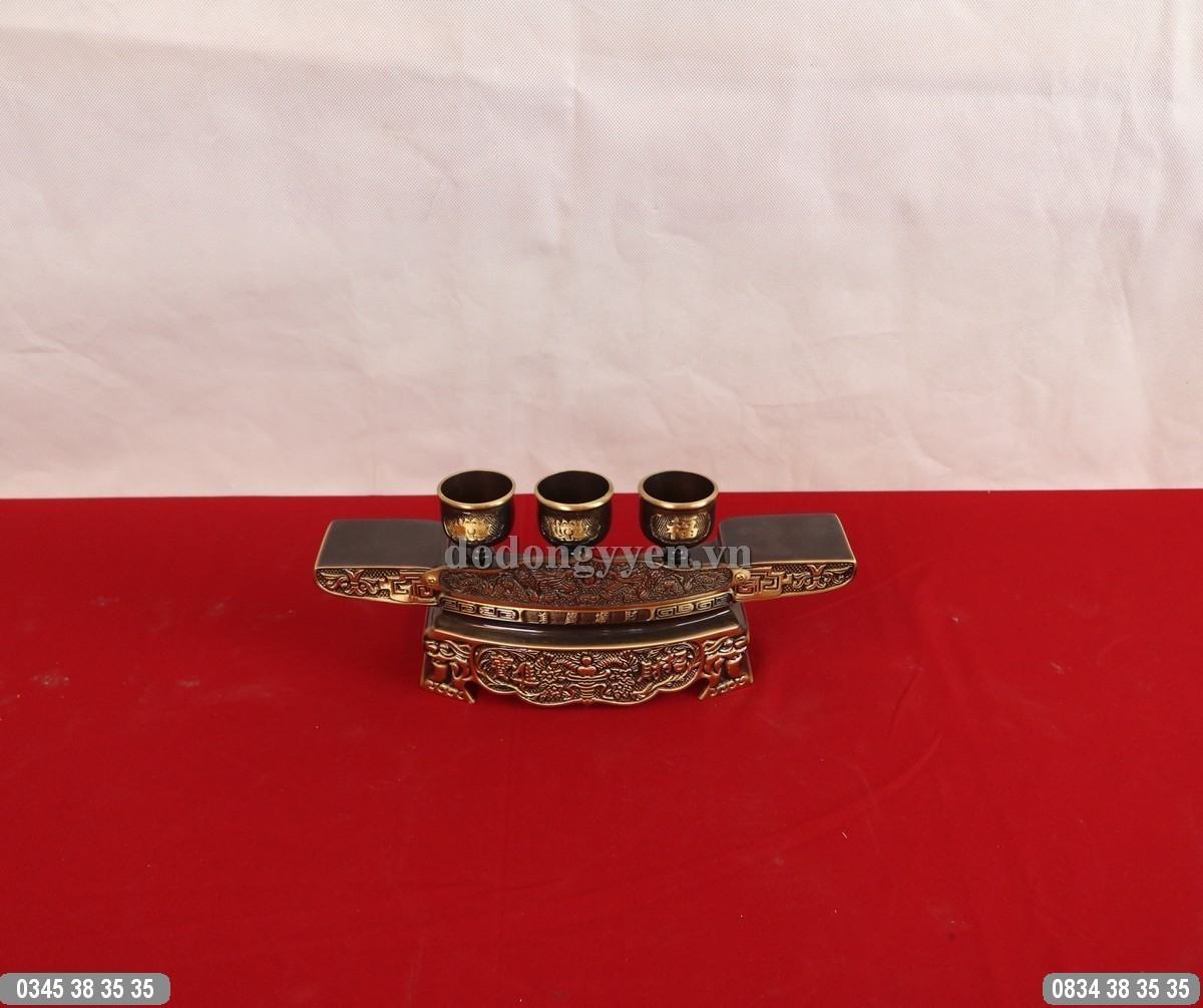 Quy cách: được đúc thủ công bằng đồng thau, xuống màu hun giả cổ độc đáo, có 2 loại khay 3 chén và khay 5 chén sử dụng cho bàn thờ gia tiên