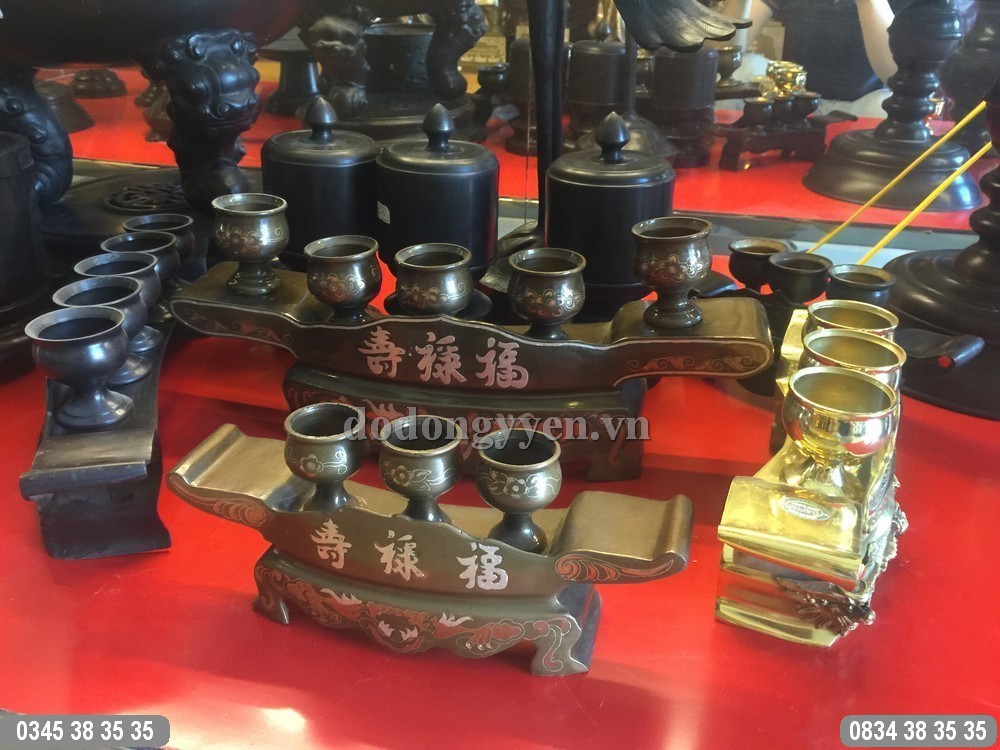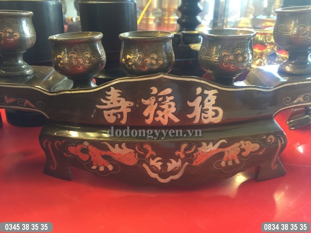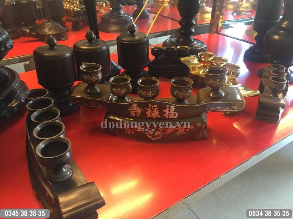 Bộ khay chén đồng (bộ ngai chén) khảm tam khí của Đồ Đồng Cường Thịnh bao gồm một ngai thờ và ba chén đựng nước. Trên ngai khảm bạc ba chữ "Phúc, Lộc, Thọ" hàm ý ước nguyện ông bà tổ tiên thần linh phù hộ cho gia đình được "Phúc", "Lộc", "Thọ".