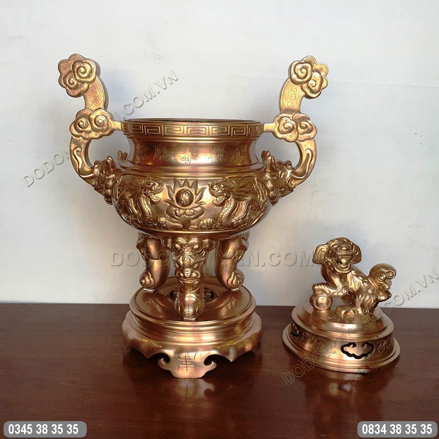 Điểm đặc biệt của bộ thờ này là họa tiết chạm nổi Song Long Chầu Nguyệt vô cùng nổi bật và sắc nét tăng thêm vẻ đẹp cho đỉnh đồng, 5 chữ chạm chìm Phúc - Lộc - Thọ - Khang - Ninh và 2 tai mây rồng được đúc liền chắc chắn được làm rất công phu. 3 Chân đỉnh chạm nổi nghê sắc nét được làm cân đối nhất để tạo ra thế vững trãi cho đỉnh. Nắp đỉnh đắp nổi nghê là linh vật linh thiêng trong văn hóa thờ cúng của người Việt Nam. Nghê giúp trấn trạch, xua đi những tà ma ngoại đạo, những điều xấu, đồng thời kích hoạt những nguồn năng lượng tốt cho gia chủ mang lại may mắn, tiền tài.