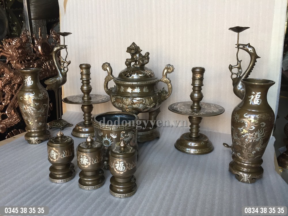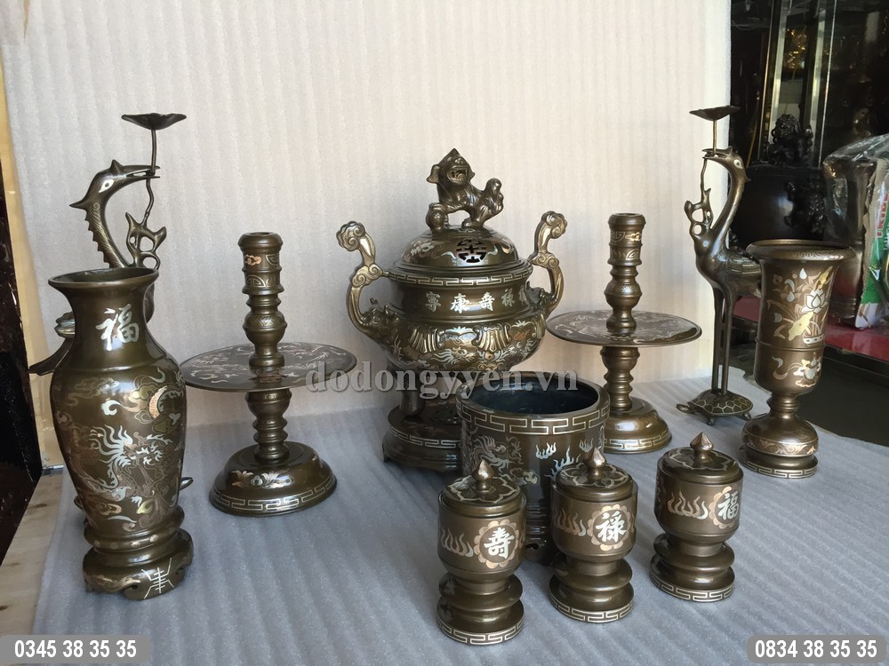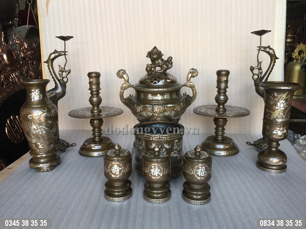 Bộ đồ thờ bằng đồng đỏ khảm tam khí vàng, bạc, đồng được đúc thủ công mỹ nghệ bởi các nghệ nhân, thợ thủ công lành nghề của làng nghề đúc đồng Tống Xá, Ý Yên, Nam Định. Bộ đồ thờ được đúc khảm rất công phu và tỉ mỉ với các đường nét hoa văn chau chuốt rất đẹp.