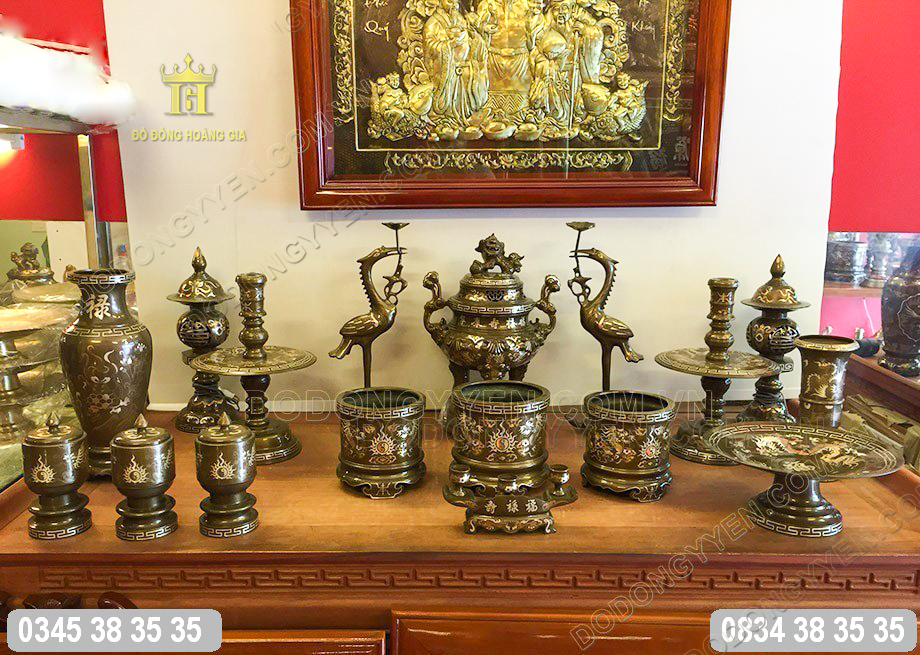 Bộ đồ thờ bao gồm một đỉnh đồng, một đôi hạc, một đôi chân nến, một đôi đèn đồng cắm điện, một lọ lục bình, một ống đựng hương, ba bát hương, bộ ba đài thờ, một mâm bồng và một khay 3 chén nước.
