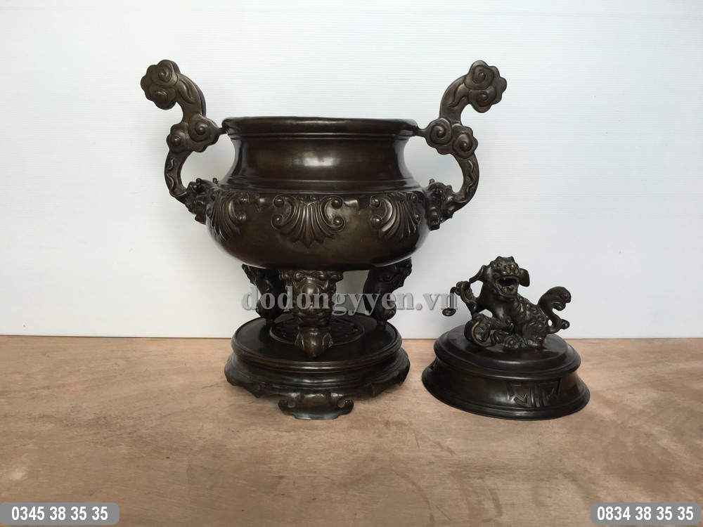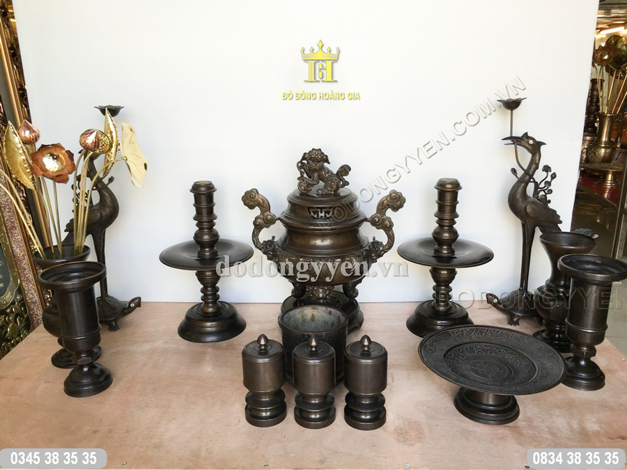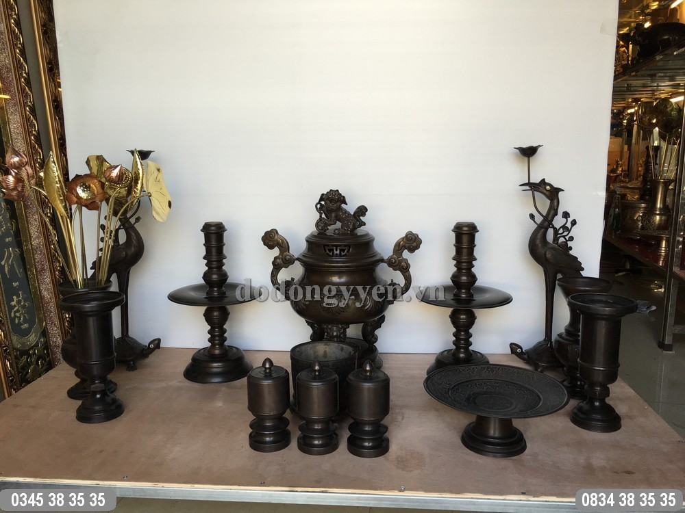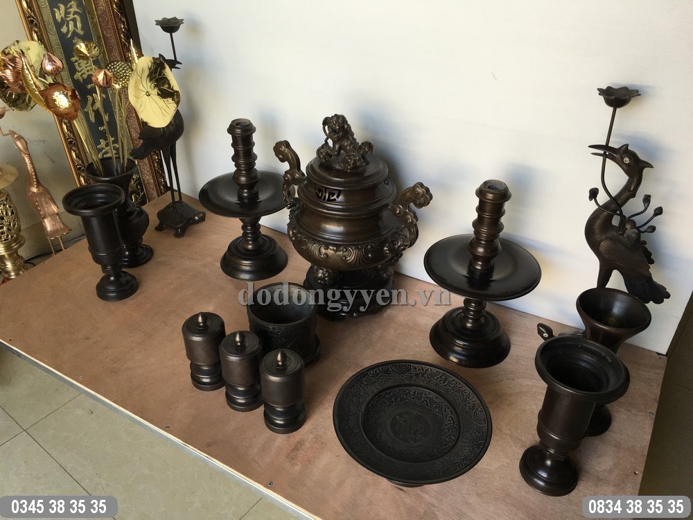 Quy cách: Bộ đồ thờ bằng đồng cát tút gồm: đỉnh đồng, đôi chân nến, đôi hạc và bộ 3 đài thờ.