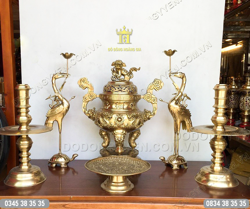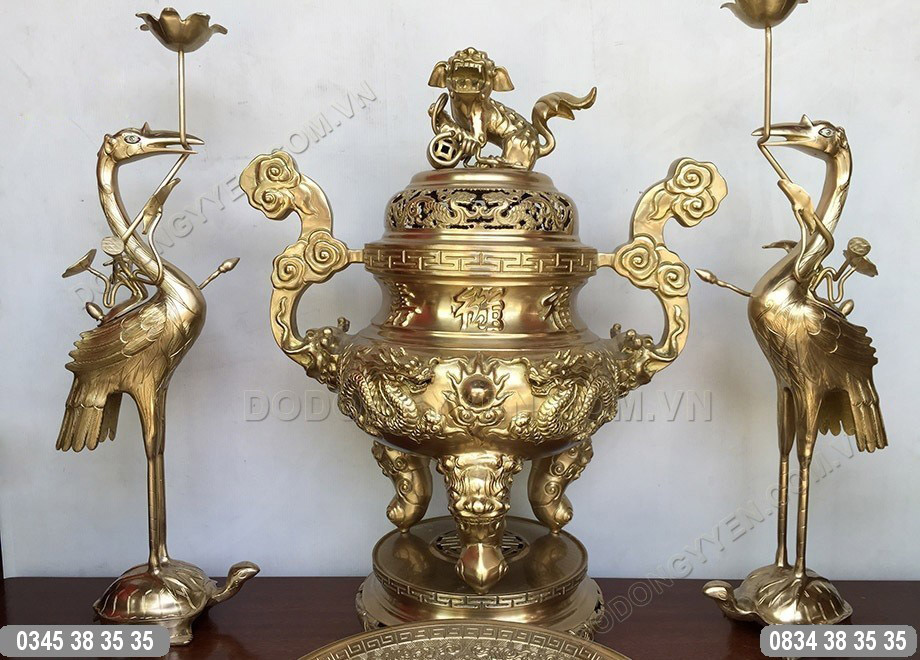 Bộ ngũ sự đồng vàng đỉnh rồng nổi bao gồm: Đỉnh đồng + 2 hạc + 2 nến