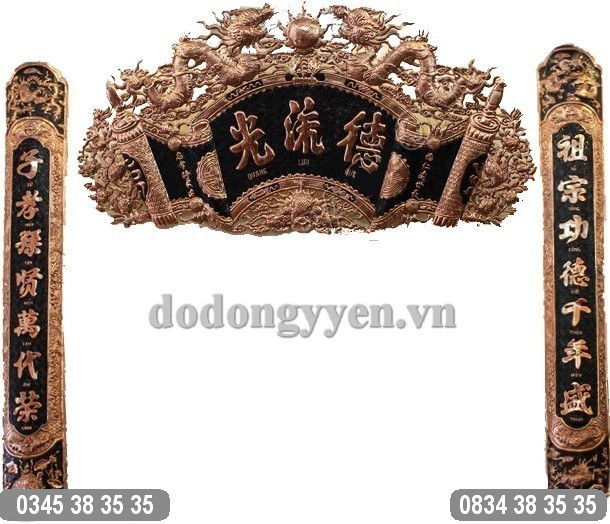 Bộ cuốn thư câu đối bao gồm một cuốn thư chạm 3 chữ "Quang Lưu Đức" và hoa văn hình ảnh song long chầu nguyệt và một đôi câu đối bằng đồng: