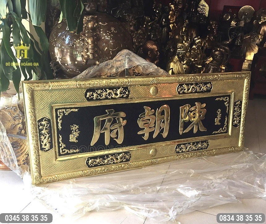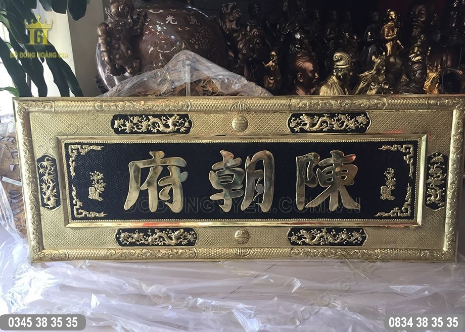 Bức Đại Tự Bằng Đồng Trần Triều Phủ 1m55 của Đồ Đồng Cường Thịnh được làm vô cùng cùng tỉ mỉ trên tấm đồng vàng dày 8 rem vô cùng chắc chắn.