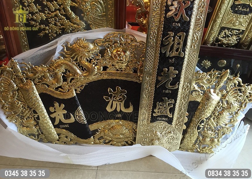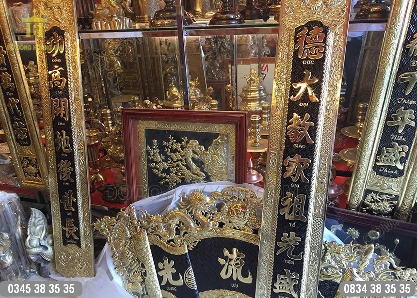 Cuốn thư câu đối thờ tự bằng đồng vàng hàng thúc tay thủ công