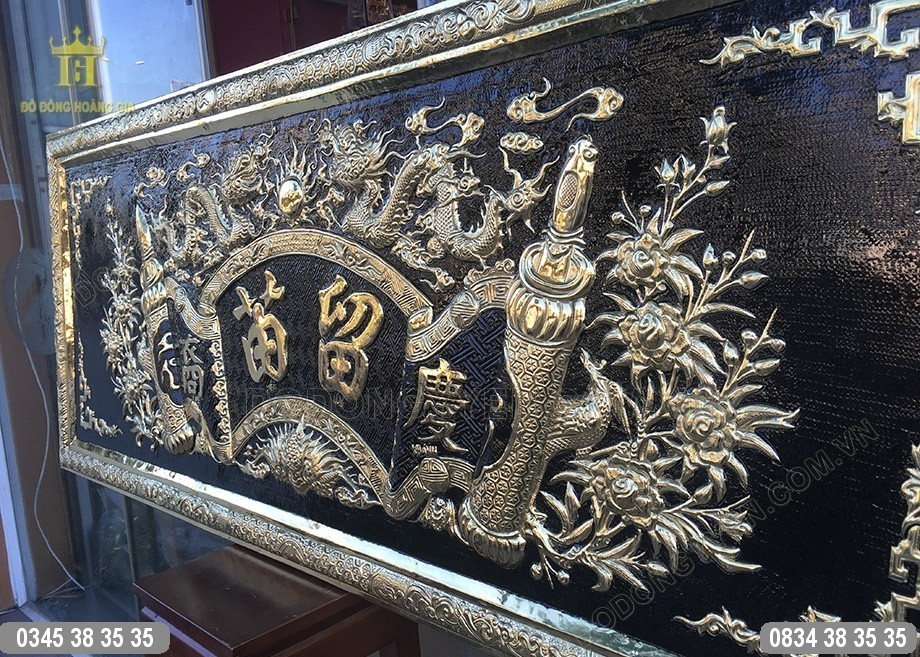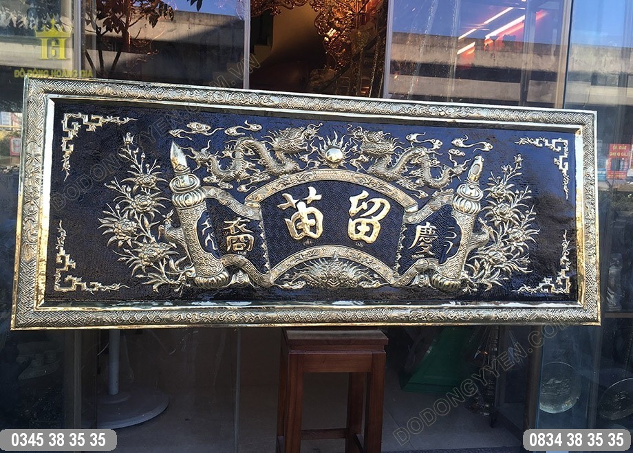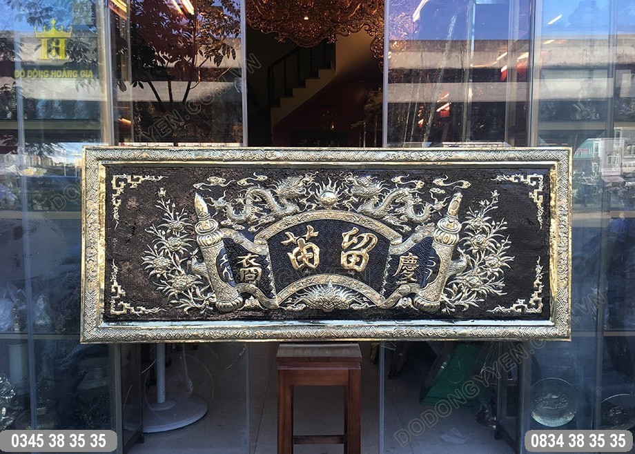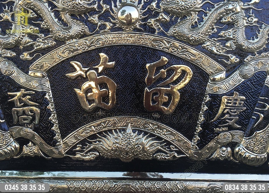 Hoành phi bằng đồng bên trong chạm chữ Khánh Lưu Miêu Duệ của Đồ Đồng Cường Thịnh được chạm thúc hoàn toàn thủ công trên tấm đồng vàng, bên ngoài hun giả cổ vô cùng đẹp.