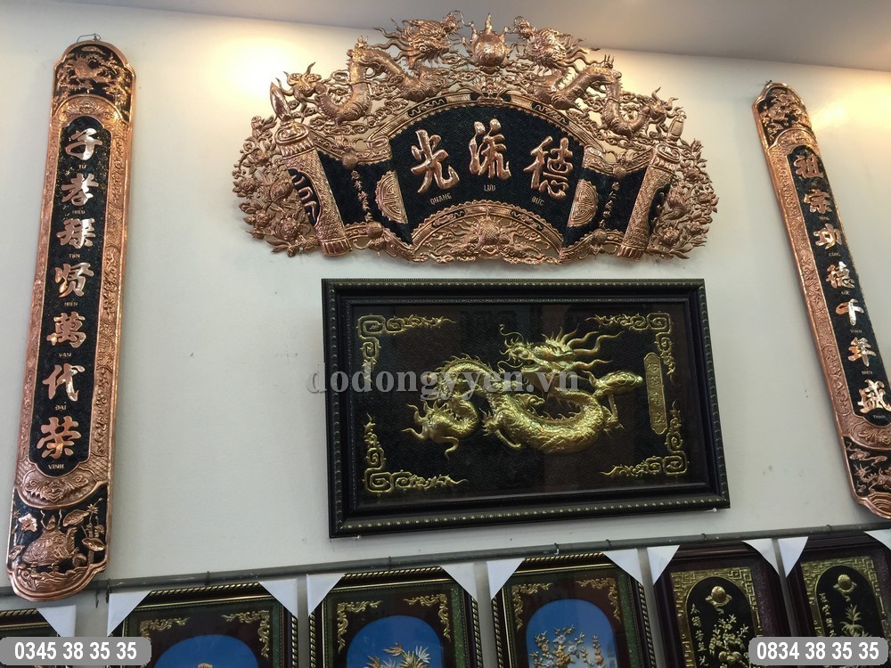 Bộ hoành phi câu đối của Đồ Đồng Cường Thịnh được chạm thúc hoàn toàn thủ công bằng đồng đỏ nguyên tấm vô cùng đẹp và sắc nét. Vật Phẩm có ý nghĩa vô cùng quan trọng trên ban thờ gia tiên.
