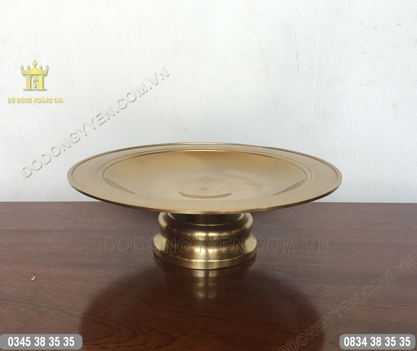 Đĩa đựng hoa quả bằng đồng vàng, đúc trơn, đúc mộc dễ lau chùi, đường kính mặt đĩa 25cm dùng để đựng hoa quả, tiền vàng thờ cúng