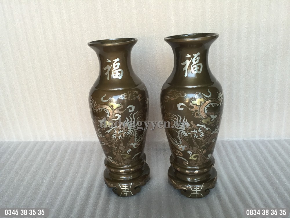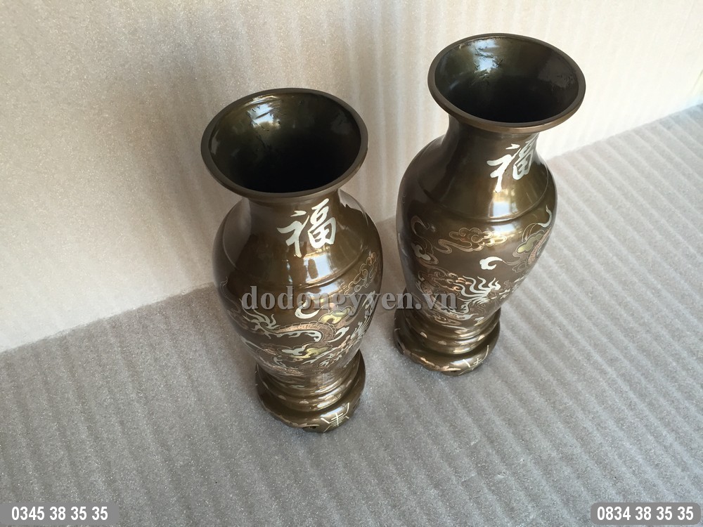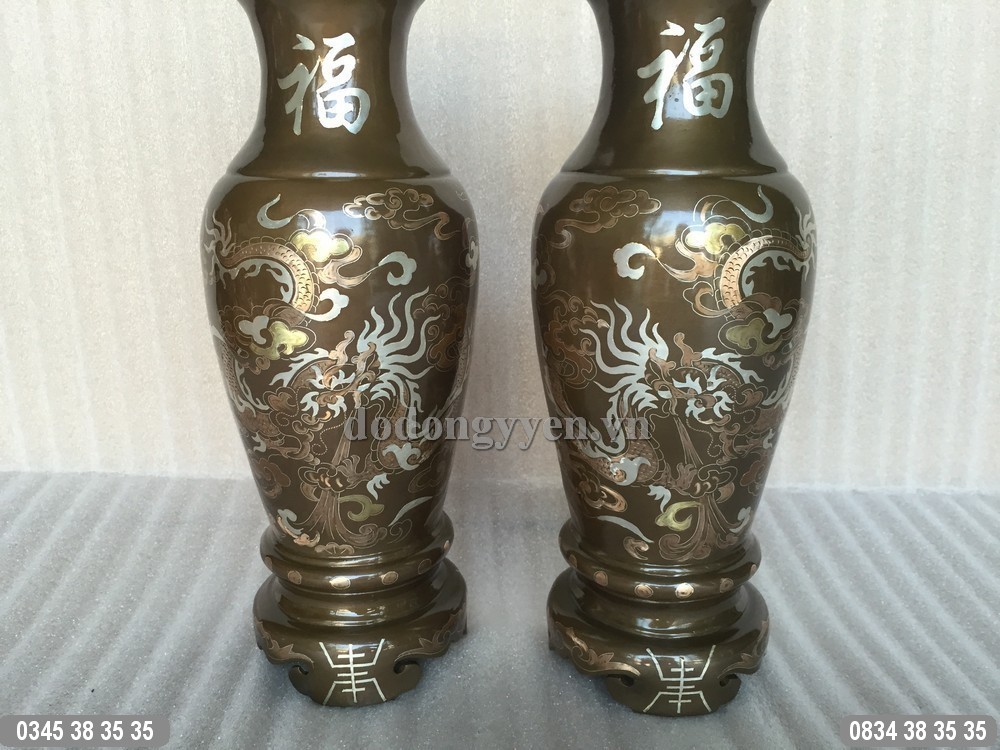 Quy cách: Được đúc thủ công từ đồng đỏ, đồng vàng, khảm bạc, bên trên khảm chữ phúc, dưới chân khảm chữ thọ, thân lọ hoa khảm rồng phượng.