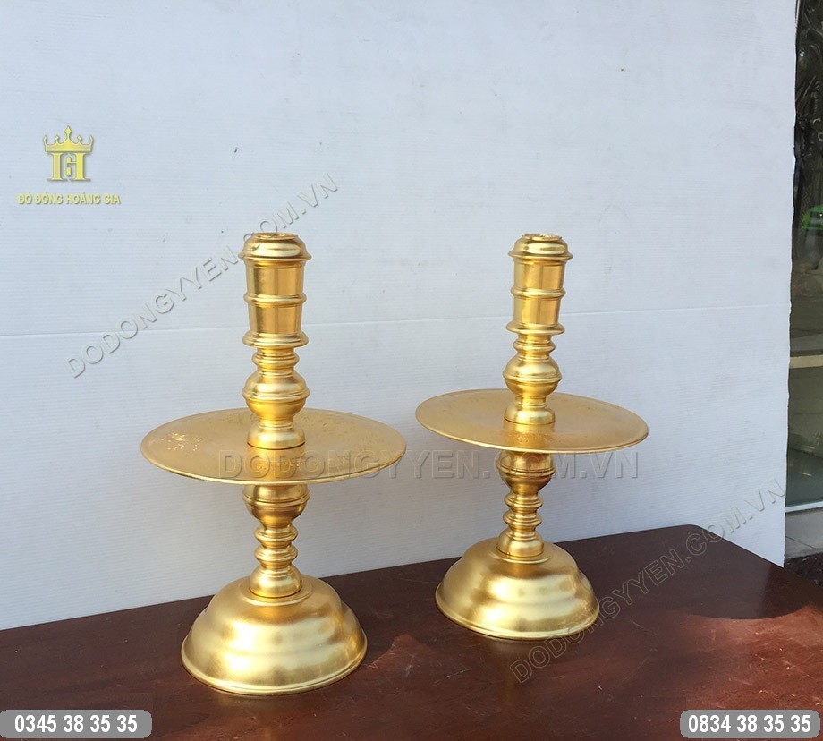 Đôi chân nến đúc bằng chất liệu đồng đỏ, dát vàng 9999 của Đồ Đồng Cường Thịnh giúp mang lại vẻ đẹp sang trọng, uy nghiêm cho không gian thờ cúng nhà gia chủ.