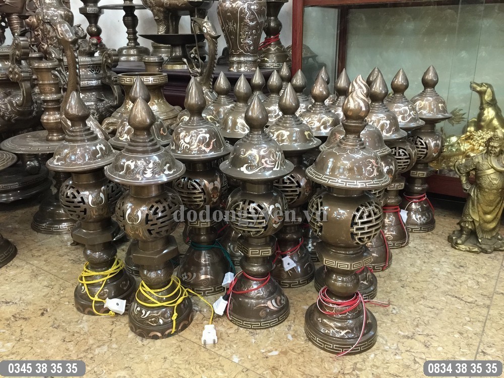 Đôi đèn thờ được đúc bằng đồng đỏ khảm tam khí cao cấp
