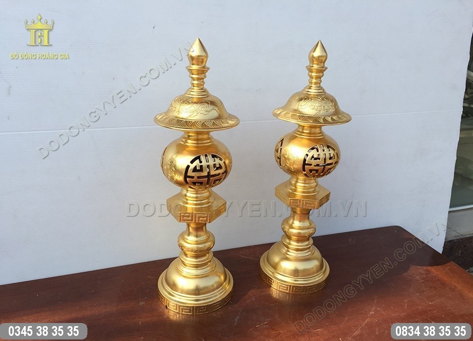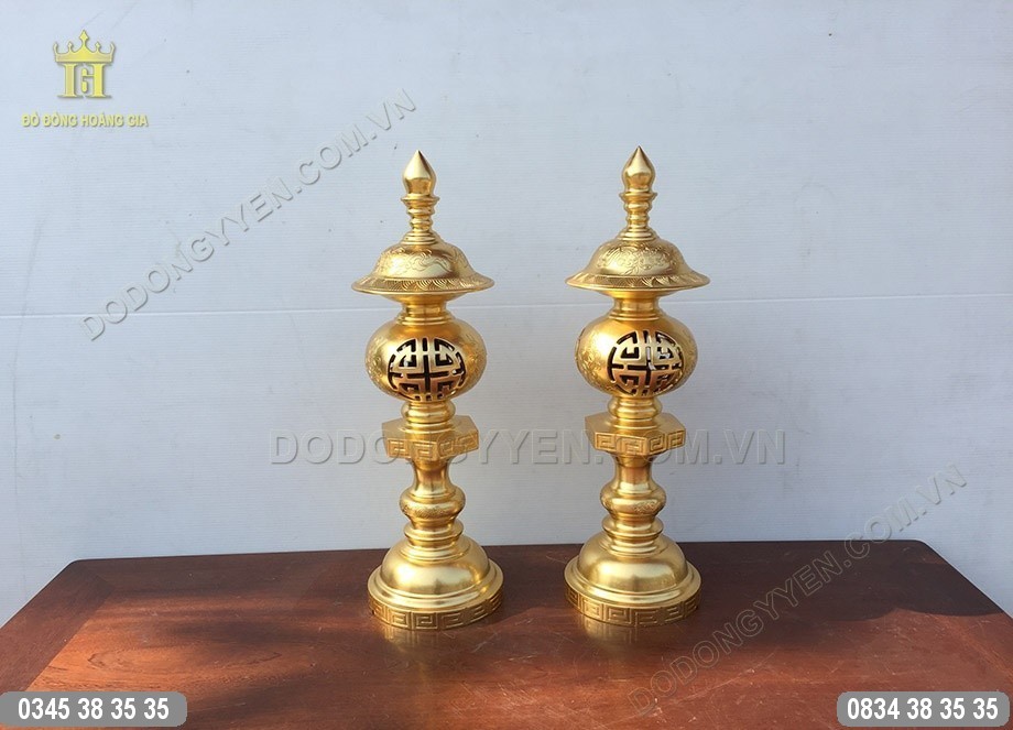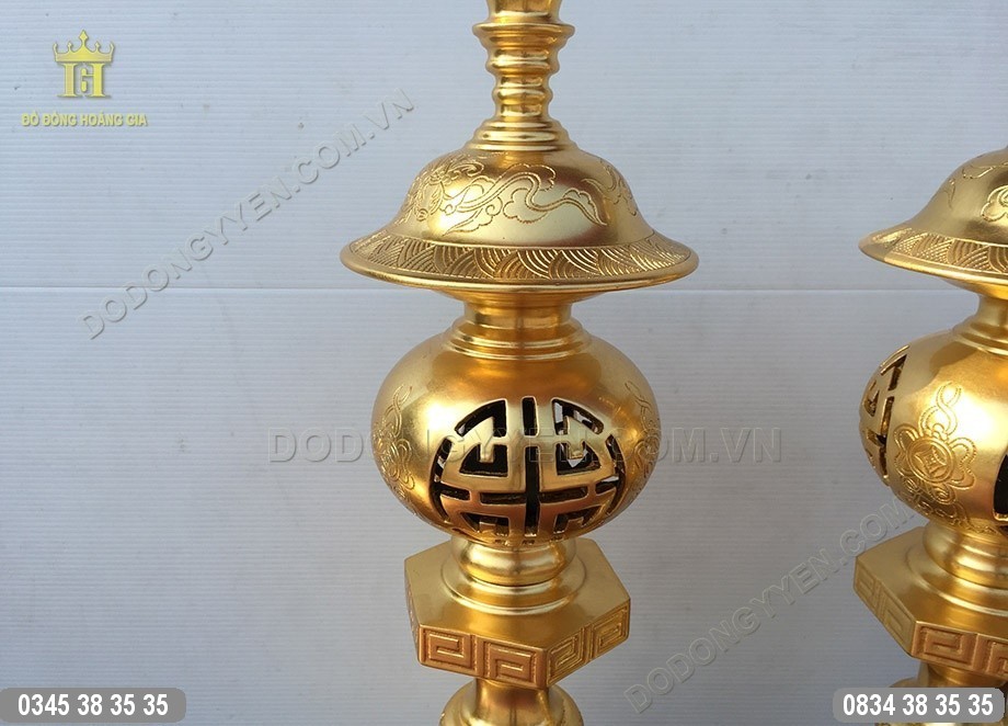 Đôi đèn đồng thờ cúng đúc từ chất liệu đồng đỏ, dát vàng 9999 của Đồ Đồng Cường Thịnh là vật phẩm giúp không gian thờ cúng nhà gia chủ thêm sang trọng, uy nghiêm hơn.