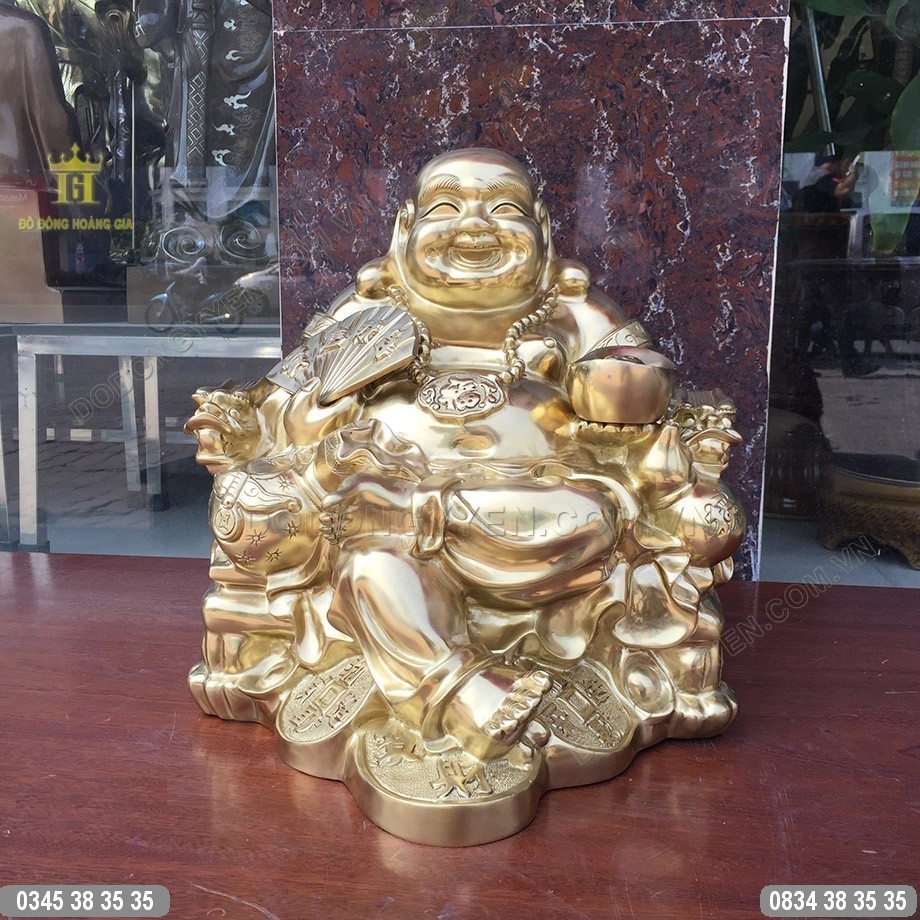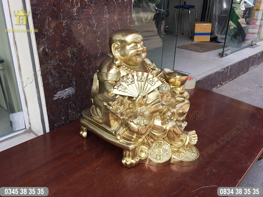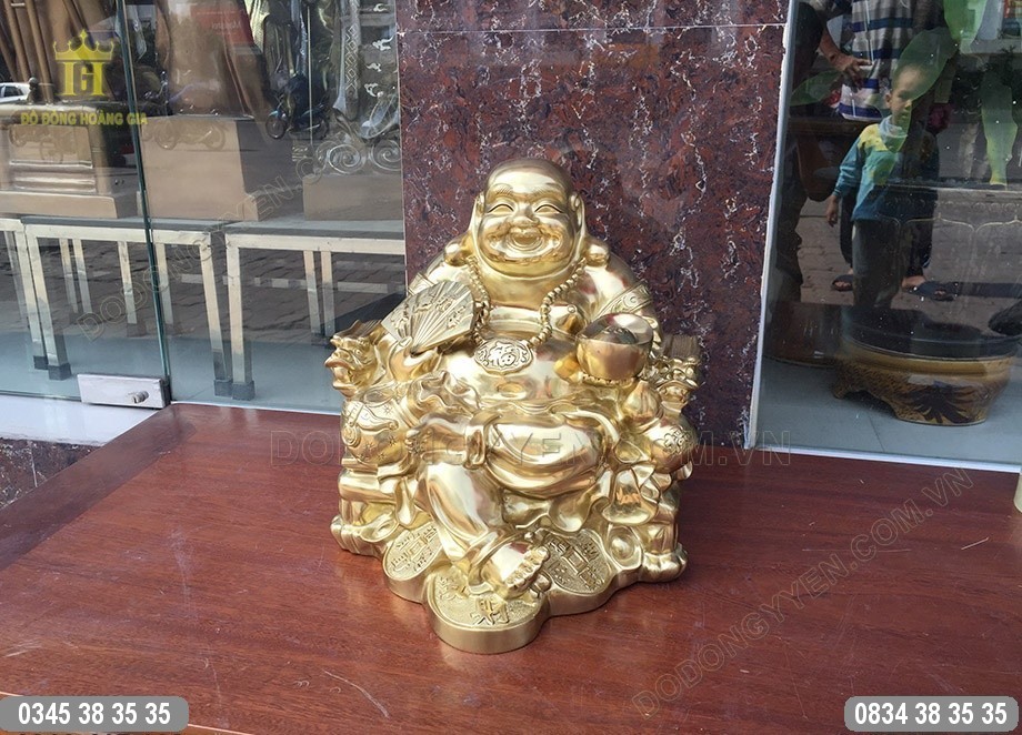Tượng đồng Phật Di Lặc có kích thước 36cm x 36cm x 36cm và nặng khoảng 35kg. Tượng miêu tả Đức Phật Di Lặc ngồi ngai rồng, một tay cầm quạt, một tay cầm đĩnh bạc, khuôn mặt tươi vui, cái bụng to tròn, là biểu tượng của hạnh phúc, tài lộc viên mãn